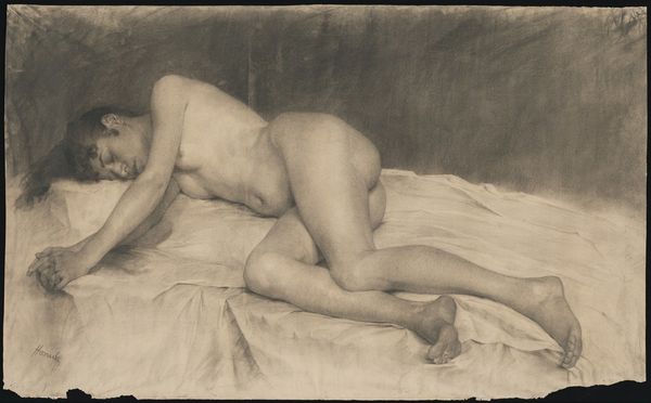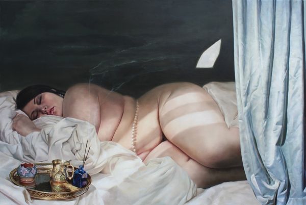 This Reclining Nude was painted by Tsuguharu Foujita using what looks like oil on canvas. It’s a study in tonal variation, playing with a restrained palette of whites, creams, and grays against a dark background. You can feel the artist feeling his way through the process. The painting has a tactile quality; the fabric beneath the nude is rendered with such care and detail that you can almost feel the weight of the body pressing into the mattress. The texture is built up through visible brushstrokes, giving the surface a subtle, almost shimmering quality. But then, there’s the contrast: the smoothness of the model’s skin against the rough background. It's interesting how the dark triangle of pubic hair punctuates the otherwise light-toned body, drawing your eye and creating a focal point. Foujita seems to be in conversation with artists like Modigliani, but his unique approach to texture and tonal range gives his work a distinct voice in the ongoing dialogue of art history. These paintings invite multiple interpretations, don’t they?