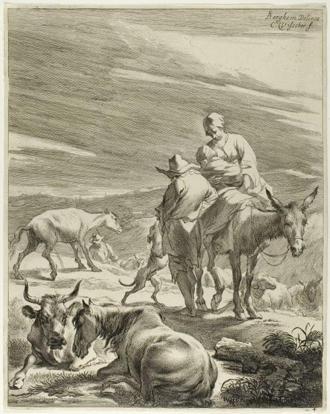 Editor: This is Frédéric Thèodore Faber’s 1837 etching, "Herderin zittend op ezel temidden van kudde" - A Shepherdess sitting on a donkey amidst a herd. It's held at the Rijksmuseum. The texture achieved with the etching is incredible, it’s delicate and rustic all at once. How do you read the social implications of a piece like this? Curator: This piece speaks to the 19th-century fascination with the "natural" life and the idealization of rural existence. Notice the serene shepherdess; how does her seemingly unburdened state contrast with the realities of rural labor at that time? The popularity of such images speaks to an urban, often bourgeois, desire for a simpler life, far removed from industrializing cities. This imagery, of course, frequently glossed over the hardship faced by those who actually lived that life. Editor: So, it’s more about what city dwellers *wanted* rural life to be, rather than what it actually *was*? Curator: Precisely. Genre paintings like this were frequently consumed by an audience craving an escape, however fictional, from the pressures of modernity. The presence of this imagery normalizes that cultural viewpoint. How do you think the medium of etching – reproducible and relatively affordable – further shaped the work’s reception? Editor: Well, the etching process would certainly enable its broader distribution, amplifying the reach of the romanticized, albeit distorted, view of the countryside. Curator: Exactly. It democratized access to this ideal, solidifying it within the broader visual culture of the time. It raises important questions about whose stories get told, and by whom, as well as the role of art in perpetuating certain societal narratives. Editor: That’s a really important point – I'll definitely look at these scenes differently from now on! Thank you for illuminating the layers of context within this piece. Curator: My pleasure. Remember to consider not only the image itself, but also its journey through different social and historical contexts. That's where the real insights often lie.