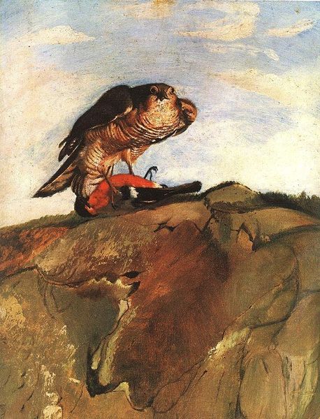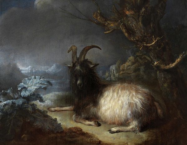 Editor: Here we have Jamie Wyeth's "The Islander," an oil painting from 1976. What immediately strikes me is the sheer texture of the ram's fleece contrasted with the misty, almost minimalist background. It feels…isolated. What do you make of this piece? Curator: Note how Wyeth constructs a visual tension through formal contrasts. The density of the sheep’s coat – its almost sculptural presence – asserts itself against the recessive space suggested by the atmospheric perspective of the sea and island. Does the tonality of the island draw your eye? Editor: Yes, the way the colors in the background get softer makes the sheep seem even more in focus. So, is the painting primarily about this visual contrast? Curator: Consider the lines. The curve of the ram's horns echoes the island's silhouette, subtly binding foreground and background. Then there is color: the subdued ochres and blues create a contemplative, almost melancholic mood. Is the Islander then a study in complementary forms, creating an intrinsic dialogue through their visual relationship? Editor: I hadn't noticed the curves echoing each other! Thinking about form rather than just the subject definitely opens up new ways to appreciate the painting. Curator: Indeed. By examining these formal elements, we move beyond a simple depiction of a ram to appreciate a sophisticated meditation on form and perception. Editor: It’s fascinating to think about how focusing on lines, shapes, and textures brings out so much more than just seeing a sheep in a landscape. Thanks!