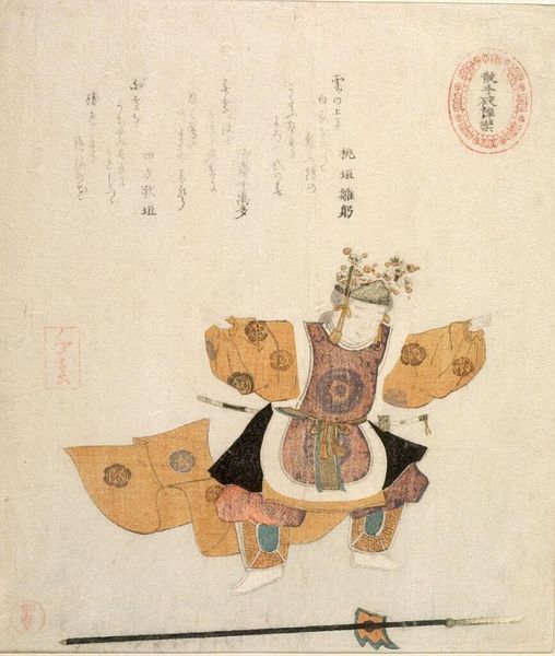 Curator: This is Takashima Chiharu's *The Bugaku Dance RanryÅÅ*. The print depicts a figure from a traditional Japanese dance. What strikes you most? Editor: It's the mask. It looks both ancient and strangely modern. How do we understand the cultural significance of this dance and its representation? Curator: Bugaku, originating in the 7th century, was traditionally performed for the imperial court. The mask conceals identity, allowing the dancer to embody a historical or mythical figure. Think about the role of ritual and performance in shaping cultural identity, and how this print might have circulated these ideas. Editor: So, the print isn't just a record, but also a way of disseminating cultural values? Curator: Precisely. And consider Chiharu's choice to represent this dance – what statement might he be making about tradition in his own time? Editor: That's a perspective I hadn't considered. Thanks for opening my eyes to the layers of meaning embedded in this work. Curator: It's a reminder that art is never created in a vacuum; it's always in dialogue with the past and the present.