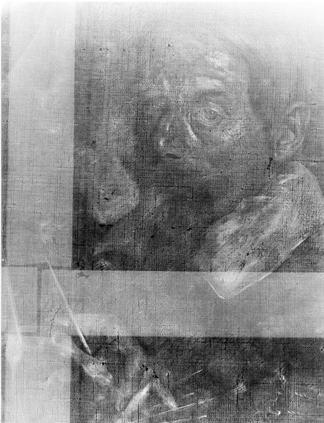 Curator: This is an x-radiograph of "A Condottiere" by the artist Dosso Dossi. Editor: It appears haunting, almost spectral. A ghostly portrait revealed through layers. Curator: Yes, the x-ray unveils the underpainting, the artist's initial thoughts beneath the visible surface. It’s a look into the creative process and art’s institutional life. Editor: Note how the skullcap-like headwear evokes classical allusions. The condottiere - a symbol of power, ambition, and maybe something darker. Curator: It also showcases the history of museum conservation practices. X-rays are an integral part of understanding a work’s condition and authenticity. Editor: It certainly adds another layer to our perception of the condottiere, revealing the hidden depths within this symbol of authority. Curator: Indeed, the layers speak to the complex socio-political forces at play. Editor: This radiographic look at the painting gives a fresh perspective into its iconic imagery.