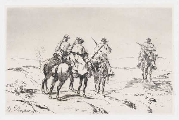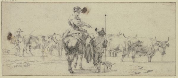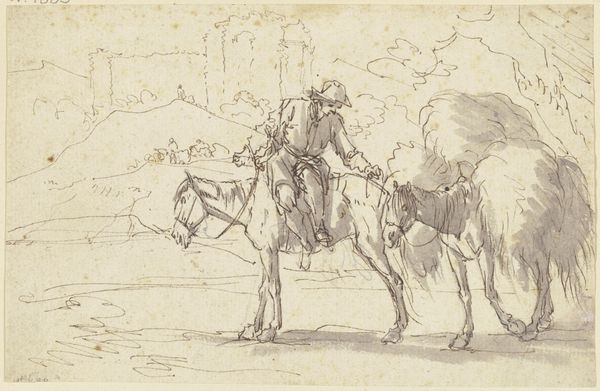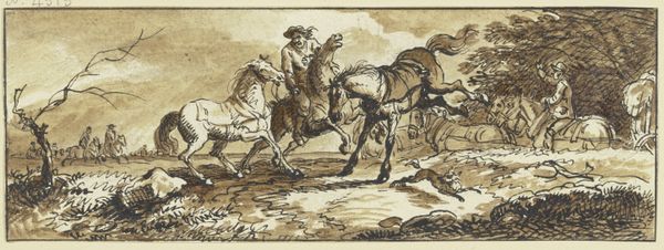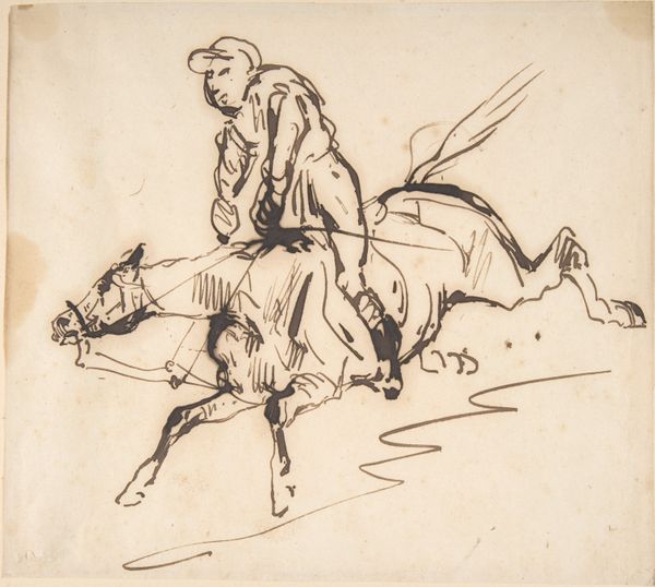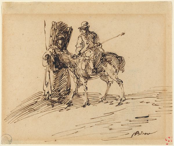 This drawing of Don Quixote was made by Wilhelm Marstrand, using pen and brown ink on paper. Looking closely, you can see how the ink has bled slightly into the fibers, giving a soft, almost blurry effect. The artist's hand is evident in the varying line weights, from delicate hatching that creates shadow, to bold outlines defining form. This directness of process conveys a sense of immediacy and spontaneity. Marstrand seems less concerned with the labor involved in creating a highly finished artwork, but rather capturing the raw energy of the narrative. The ease of its production allows the artist to explore the themes of the novel, like the clash between the ideal and the real. It is a study in character rather than a display of technical virtuosity, a reminder that the value of art lies not only in its materials or the artist's skill, but also in its ability to capture the human condition.