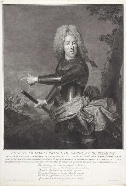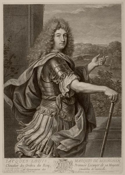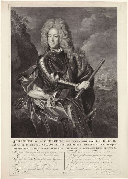 Editor: This is Bernard Picart's "The Duke of Marlborough." Look at that wig! It’s… intense. But beyond the fashion statement, I'm curious about the story it tells. What do you see in this piece? Curator: Ah, yes, the wig! Almost a character itself, wouldn't you say? This isn't just a portrait; it's a carefully constructed image of power. Picart wants us to see Marlborough as both a military leader, note the armor, and a refined aristocrat. The distant battle scene, juxtaposed with his serene expression, really speaks volumes about the controlled chaos of leadership. It reminds me of balancing my own checkbook – all that meticulous detail somehow ends up in… well, you know. What do *you* make of it? Editor: I guess I didn't really see the dichotomy between the chaos and the serenity at first. It is quite the contrast! Curator: Exactly. The controlled chaos is key. We often forget the artistry of calculated composure. Editor: Thanks, I never would have thought about it that way.