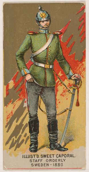 Editor: Here we have “Artillery, Train, Germany, 1886,” a print and drawing from 1888, part of the Military Series produced by Kinney Tobacco Company. There's a certain stiffness to the figure, and the patterned background is visually quite strange, given the military subject. What do you make of this unusual piece? Curator: The stiffness you observe might be interpreted as a reflection of the rigid social structures and militaristic culture prevalent in Germany at that time. The image normalizes military values, reinforcing hegemonic masculinity. The patterned background, almost musical, subtly links the order of the military with broader social harmony – or perhaps a manufactured one. What purpose do you think the commercial context serves here? Editor: So you’re saying that this wasn't necessarily created for art's sake, but as propaganda? Curator: Propaganda is a strong word, but the card undoubtedly played a role in shaping public perception. By associating military imagery with a consumer product like cigarettes, Kinney Tobacco Company contributed to the normalization and even idealization of military service. These cards circulated widely, especially among young men, potentially influencing their aspirations and values. How do you feel about this blend of commerce and military ethos? Editor: It definitely makes me uneasy, especially considering the history of militarism in Germany. Seeing it tied to something as trivial as a cigarette card is disturbing. It’s like, who is this actually for and what's it trying to sell, really? Curator: Precisely! It highlights how seemingly innocuous everyday objects can be powerful tools in shaping cultural attitudes and perpetuating specific ideologies. The image offers insights into the complex intersections of militarism, consumer culture, and national identity in the late 19th century, urging critical reflection on how such systems continue to operate today. Editor: I hadn’t considered the underlying cultural messages so explicitly. This puts the artwork into a much clearer, if darker, context for me. Thanks!
