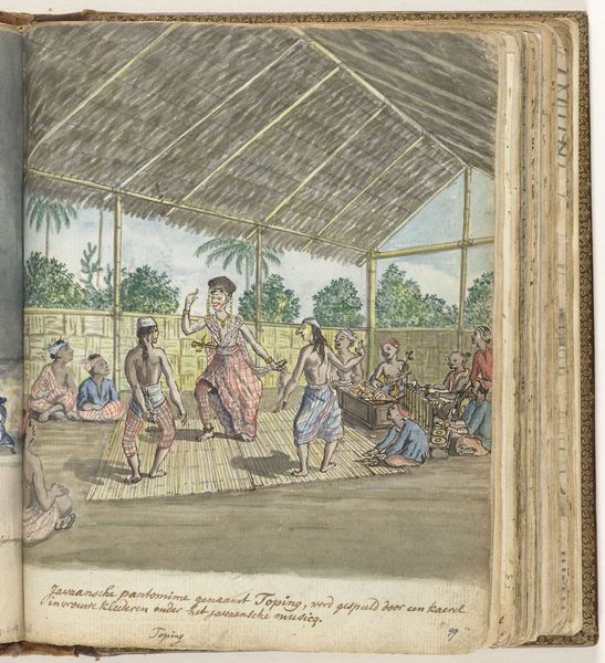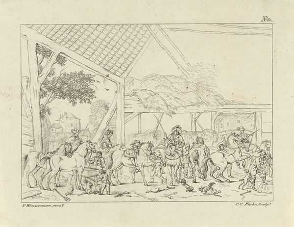 Curator: This is a drawing from between 1744 and 1765 by Jean Covitré. The inscription tells us that this is an engraving of "Women of the Bellales tribe on Ceylon making butter," done in ink. Editor: It’s quite striking. The scene has a casual feel, depicting everyday labor. What catches my eye, though, is the rendering of the figures and space with lines. What aspects of the visual elements stand out to you? Curator: I note the compositional structure, which seems organized through the canopy that visually segments foreground and background, thus dividing labor and leisure. What strikes me foremost is how line quality varies. See how short, repetitive strokes define figures against a stark negative space. Editor: I see what you mean, the composition directs us, guiding our eye around different areas of the drawing. Are you drawn to anything besides the contrast of positive and negative space? Curator: Note the subtle use of shadowing around the figures which defines form and adds some depth to an otherwise flattened perspective. What could the recurring palms mean beyond just providing depth to the scene? Editor: The palm trees and open structure lend a unique view into the cultural setting… How might the scene reflect this artistic style? Curator: We can observe some characteristics typical of its period; its approach to capturing an ostensibly authentic scene. The details of posture are translated with strong visual precision and depth by utilizing minimal tonality. The contrast almost reminds you of chiaroscuro. Editor: Right, that high contrast with focused light shaping form makes me see the scene with a certain starkness. Curator: Exactly. The success lies in manipulating line and form that make it unique, not the reference it could offer to the colonial view of Ceylon. Editor: Thank you. Now I’m also noticing the engraving focuses on how these visual qualities work in tandem. Curator: Yes, and those aesthetic qualities define the very artwork.