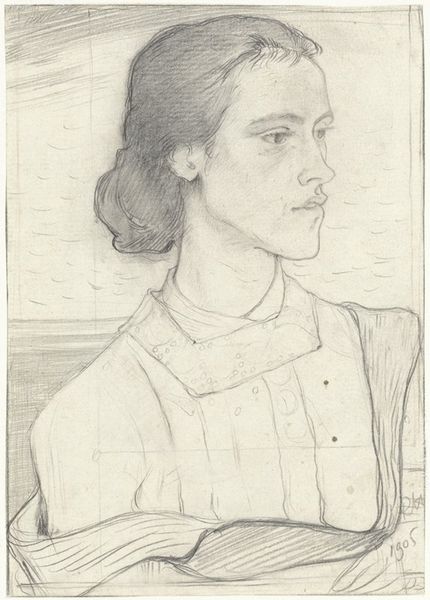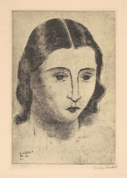 Editor: Here we have Hans Thoma's "Head of a Girl I (Elisabeth La Roche)," a finely etched print. The detail is incredible, but I'm struck by the stark contrast and the subject's averted gaze. What do you see in this piece, considering its formal elements? Curator: The emphasis lies in the linear precision. Note the cross-hatching, building tonal depth and volume. The composition guides our eye along the delicate profile, then to the intricate braid. It is a study in form and light, wouldn't you agree? Editor: I do, now that you mention it. The subtle variations in line weight really define the planes of her face. I initially overlooked that. Curator: Exactly! The artist masterfully manipulates the medium to create a compelling image through purely visual means, irrespective of narrative. It's about the how, not necessarily the what or why. Editor: That's a great way to think about it. Thanks for pointing out the formal aspects. Curator: Indeed. Focusing on these structural components allows for a deeper understanding.