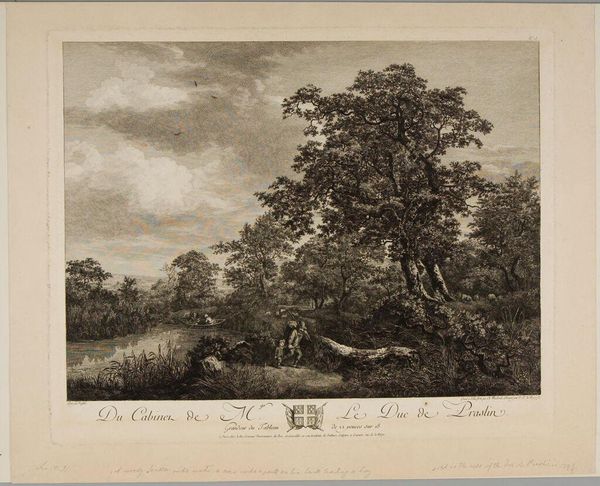 Editor: This is "Cornard Wood" by Maria Catharina Prestel, currently held at the Harvard Art Museums. It feels like a glimpse into a serene, almost untouched landscape. What strikes you most about it? Curator: I see a commentary on land use and access. Note the figures – are they idyllic inhabitants, or do they represent something else? This period saw increasing enclosure of common lands, impacting rural communities. Editor: So, you’re suggesting the image isn’t just a peaceful landscape, but potentially a statement about social change and perhaps even loss? Curator: Precisely. How does knowing a woman created it shift our understanding of the pastoral tradition? Does her perspective offer a critique of patriarchal land ownership? Editor: That completely reframes how I see the work! It adds layers of meaning I hadn't considered before. Curator: It's vital to remember that artistic choices often reflect and engage with the socio-political realities of their time.