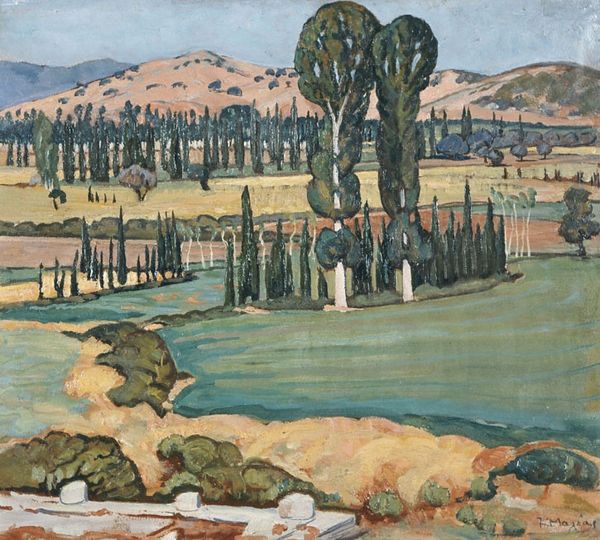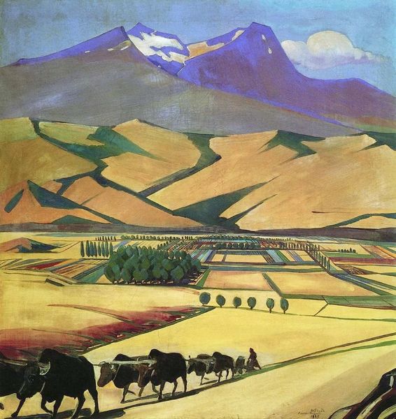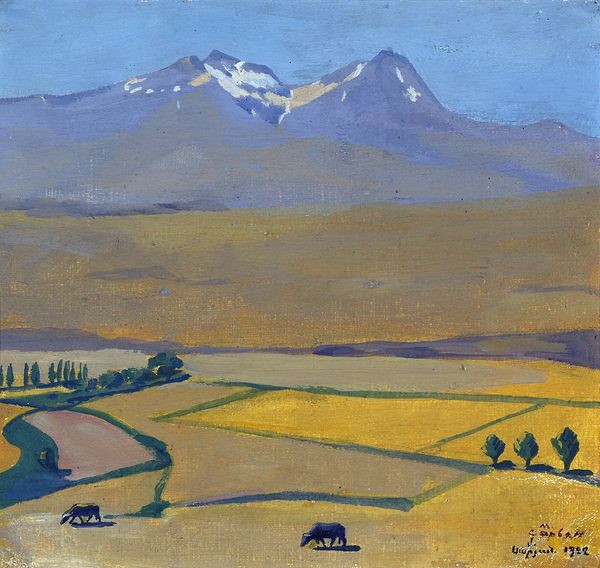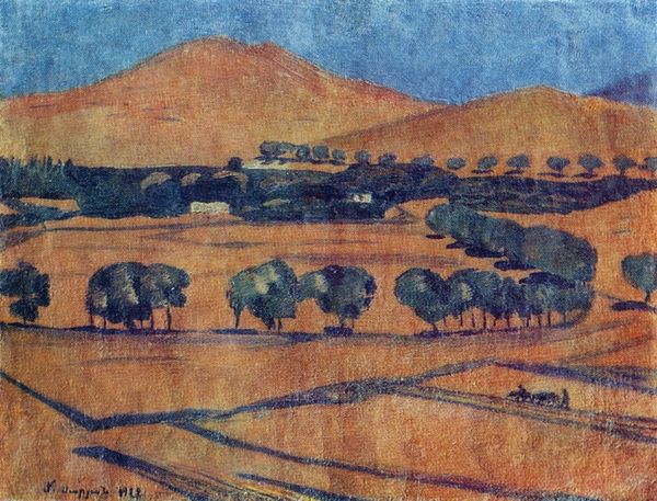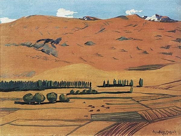 Curator: Martiros Sarian's "Geghama Mountains," painted in 1926. He used oil paint to conjure up this evocative scene. What are your initial thoughts? Editor: The color overwhelms me—a near monochromatic expanse of ochre. It creates a strange, almost dreamlike, atmosphere, intensified by the simplified forms of the landscape elements. Curator: Absolutely. Sarian's work, while aesthetically beautiful, sits within a period of immense social change in Armenia under Soviet rule. It depicts a seemingly timeless landscape. The role of the Armenian artist within this rapidly evolving context had been redefined as educators and propagandists. Editor: I notice the handling of the paint itself—relatively flat, with minimal layering. What impact do you think that had on the art production in his social context, compared with other avant-garde movements of the time? Curator: I agree. The flatness allows Sarian to focus on pure color relationships. The limited range and deliberate placement give us a landscape that is more symbolic than naturalistic. He's not attempting photographic realism. Also, consider the physical act of painting outdoors and its impact during a post-revolutionary period. Was painting "from life" politically safe or artistically risky? Editor: Interesting point. While it appears straightforward, the landscape itself acts as a vessel of political message or commentary about Armenian identity or memory? The lack of detail becomes almost political in itself! Curator: Precisely. Sarian was working with very specific social requirements about how landscapes should be produced, yet he's clearly bending those constraints. Editor: The material reality is this, though. Oil paint offers stability and relative speed in its application compared to some other materials like fresco or mosaic, used previously in sacred or community building settings in Armenia, it can be framed easily to be collected for display. The oil medium, through which national art takes to new spaces of power through mobility. Curator: It is really a fascinating case study of how personal expression navigates through times of institutional and socio-economic changes. Editor: Definitely. Looking at the scene in oil and analyzing the cultural factors, this piece reveals how an image mediates cultural production and expression through labor in difficult circumstances.