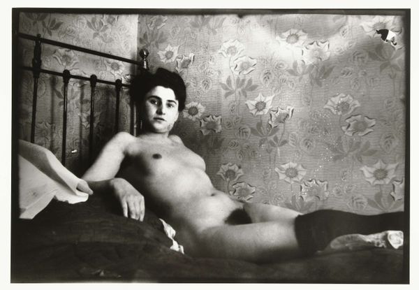 Curator: This black and white photograph, taken in the 1970s, is titled "A student. Studio Shehrazade, Saida, Lebanon" and is attributed to Hashem el Madani, via the curatorial work of Akram Zaatari. Editor: It's striking—her eyes are so direct, but the pose feels playful, almost like a game of peek-a-boo around that silver column. Curator: The column acts as both a structural element and a symbolic barrier, doesn’t it? Studio portraits often use props to convey a sense of status or aspiration. Editor: I wonder what she's studying, and if this photograph was meant to project a certain image, or just capture a moment of youthful self-discovery. There's a timelessness to it, a feeling of universal experience. Curator: Indeed. Zaatari’s curatorial eye brings layers to Madani's work, prompting us to consider the archive itself as a space of cultural memory and interpretation. Editor: The silver column and the floral dress create a powerful and almost conflicting contrast. It really makes you think!