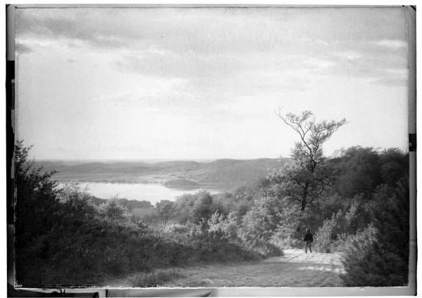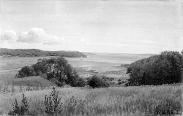 Curator: Welcome! We are standing before Vilhelm Kyhn’s "Udsigt over Vejle Fjord," or "View of Vejle Fjord," painted en plein air in 1854. Editor: There is a striking sense of tranquility here, despite it being a black and white rendering, with a stillness blanketing the water, contrasted by the layered textures of the surrounding foliage. Curator: Indeed, Kyhn, working within the Romantic and Realist traditions, meticulously depicted this vista. Oil on canvas allowed him to capture not just the physical location, but the atmosphere of Vejle Fjord in Denmark. Let’s consider the materiality: the brushstrokes, the build-up of pigment...they all contribute to the tangibility of the scene. The fact that it’s rendered in grayscale makes me wonder what pigments would have been available in 1854 and if cost or accessibility factored into the piece's final appearance? Editor: That’s a compelling question to consider. Thinking about it, this artwork could be situated within broader narratives concerning Danish national identity in the mid-19th century. Romanticism was, after all, used by countries across the continent in constructing ideas about 'folk' and attachment to 'place' against a backdrop of changing political conditions. How do you see Kyhn engaging, either consciously or unconsciously, with notions of landscape as an idea, a cultural touchstone? Curator: The artist clearly draws attention to his technical abilities as a painter to bring us into an understanding and feeling about the natural world. Editor: Precisely! His depiction does make me wonder who was able to access and experience landscapes like this, both visually through art, and materially through travel. We can interpret a work like this for whom, what was the intention of the landscape tradition and why should we reconsider it? Curator: A good point: to broaden our interpretation, the image and material record can further investigate the power structures present in the consumption and interpretation of nature's beauty. Editor: This artwork really stimulates a broader conversation and challenges the norms regarding landscape traditions in art and nature! Curator: Absolutely. I will now consider all the socioeconomic considerations more broadly.