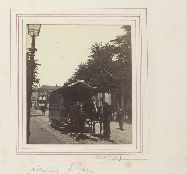 Editor: This albumen print, taken sometime between 1889 and 1893, captures a horse-drawn carriage waiting in front of a house. It exudes a certain stillness. What layers of meaning do you find in this tableau? Curator: The image holds a silent tension, doesn't it? The waiting carriage—it's a loaded symbol. The carriage, the horse, the very posture of the driver... it's all about anticipation, but of what? Are they waiting for someone? Is someone inside, about to emerge? Consider the cultural memory embedded here. The horse-drawn carriage wasn't merely transportation, it was a marker of status, of access, a visual shorthand for a particular social class. Editor: So, it's not just a scene; it's a statement? Curator: Precisely. The home in the background too, with its symmetrical façade and shuttered windows, speaks to order, to established wealth. Notice how the photographer, Johanna Margaretha Piek, has composed the image. The tonality of the print almost feels like a veil, obscuring more than it reveals. Is it longing or resignation? This becomes less about what we literally see and more about what we, as viewers, project onto the image. Editor: I hadn't thought about that projection. It makes me consider who I imagine inhabiting that home and using that carriage. Curator: The enduring power of images rests in their ability to be both a reflection of a particular moment and a mirror reflecting our own preoccupations and perspectives, shaped by history and individual lived experience. Editor: That gives me a fresh lens for seeing these kinds of images. I see it as less of a picture and more as an invitation now! Curator: Precisely! Each viewing reveals something new, layering meaning upon meaning.