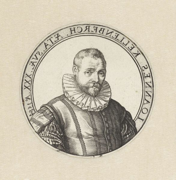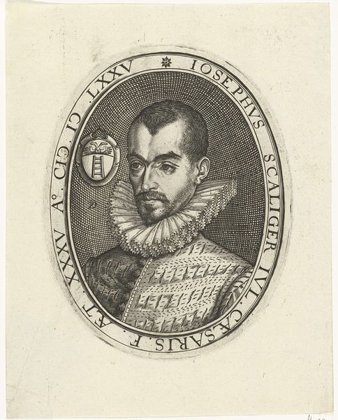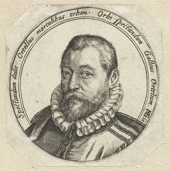 Curator: Welcome to the Rijksmuseum. We're standing before a striking portrait: "Portret van Dirck Jansz. Uyttenbroeck, burgemeester van Delft, op 51-jarige leeftijd," created in 1577 by Wierix. It’s an engraving, offering us a window into the late Renaissance world of Dutch governance. Editor: My immediate impression is gravitas, a severe dignity. The close cropping of the subject within that perfect circle only enhances that sense. But what fascinates me most is that circle itself, inscribed with precise text and decorations—a self-contained universe of authority. Curator: The choice of engraving as a medium speaks volumes. Printmaking allowed for wider dissemination of portraits, extending influence. Consider the labor involved—the meticulous carving of lines into a metal plate to capture detail. Each tiny hatch mark represents time, skill, and intention. Editor: Absolutely. It is fascinating how those linear details bring weight to the man, Dirck Jansz, the mayor. What I find particularly striking is the repeated emphasis on his identity: His name and age literally circle him, and even adornments become part of a symbolic shield. The artist creates a sort of emblem of civic power. Curator: Notice the attention to detail in his clothing. The intricate patterns and texture suggest luxurious fabrics and the wealth necessary to acquire them. These were status symbols. Think about the market for these prints, primarily wealthy burghers and civic leaders, and the way they were consumed, not simply as art, but as emblems of class and influence. Editor: The more I examine this piece, the more it evokes a sense of stability and permanence that was critical to those in power. From the ornamental details in the upper section to his unwavering expression and elaborate collar— everything emphasizes the solidity of his social role. One could suggest this wasn’t a simple portrait, but rather, it was meant to project strength, permanence, and a claim to enduring recognition within Delft's social tapestry. Curator: Looking at it from a Materialist perspective allows me to appreciate not just what it represents, but the how, and the why it was made in the first place. Considering that each piece meant that materials and manpower was needed. The art also reflects that status and authority were not abstract things but something to be owned and performed. Editor: Examining how this portrait acts as a tapestry of signs shows how artistic production contributes to forming societal narratives and collective memories, leaving lasting impact on both individual identity and communal consciousness.