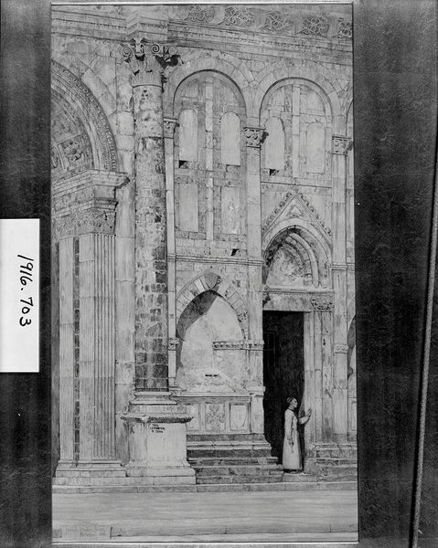 Curator: This is Joseph Smith's "Doorway, San Marco, Venice, Italy," housed here at the Harvard Art Museums. Editor: It's like a shadowy stage set, isn't it? Ready for a drama about to unfold. Curator: Smith has rendered the doorway with such careful detail, note the intricate carvings on the capitals. The image of the Saint above the door. Editor: The doorway definitely feels like more than just an entrance. More like a portal, really. The way the dark interior beckons... it's almost unsettling. Curator: Doorways often function as thresholds in art, symbolizing transitions or invitations into different realms. This one seems to echo centuries of faith and history. Editor: Absolutely. It’s heavy with time, a tangible weight. Makes you wonder what stories that stone could tell, doesn't it? Curator: Indeed. It's a compelling image, capturing both architectural precision and an almost palpable sense of history. Editor: A perfect blend of what is seen and what one imagines. Thanks for pointing that out.