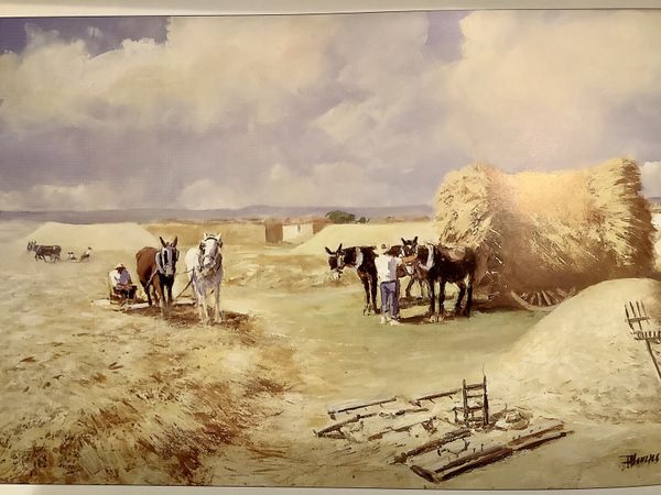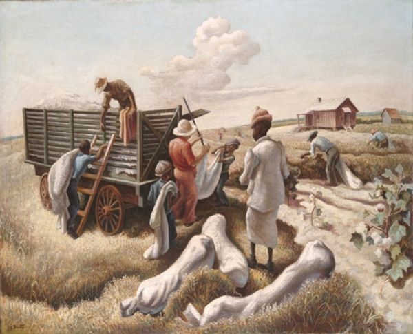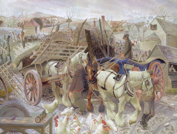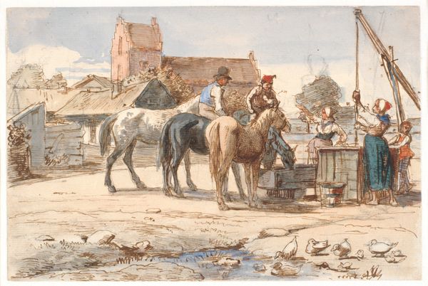 Editor: So, this is Hans Smidth’s oil painting, "A Stranger Asking his Way at a Farm on the Moors," painted in 1877. I'm struck by how much detail Smidth includes; it really feels like we’re peering into a specific moment in time. What details jump out at you? Curator: The figures, of course, but also their placement in a vast, windswept landscape and the architecture. Consider this painting through the lens of land ownership and the historical displacement of rural communities. What narrative do you think Smidth is presenting? Editor: Well, the stranger seems almost out of place on horseback. He contrasts quite strongly with the people around the farmhouse; perhaps it is a comment on the emerging class divisions within Denmark at this time? Curator: Precisely! Notice the dress of the people versus that of the rider and consider the power dynamics implied. This is 1877. Rural Denmark was changing rapidly, with industrialization and urbanization impacting traditional ways of life. Smidth isn't just painting a genre scene; he is portraying the tension between tradition and modernity, between the landowners and the rural population. What kind of dialogue does the composition establish, then? Editor: It’s almost like he's using the landscape itself to represent the broader socio-economic conditions and power dynamics at play! I now wonder who actually gets to traverse the moors. Curator: And who *owns* the narrative being presented? Consider also how notions of Danish national identity were being constructed and negotiated during this period, with artists like Smidth playing a crucial role in shaping perceptions of rural life and its inhabitants. Editor: That's given me a lot to think about. It’s made me realise there’s so much more going on beneath the surface of what at first just seemed like a quaint scene! Curator: Indeed. By examining the painting through a contemporary, critical lens, we unveil its complexities and reveal its lasting relevance in understanding the forces that continue to shape our society.