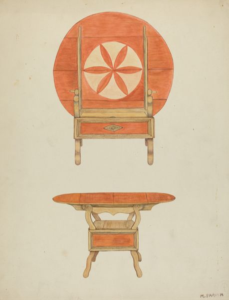 Fritz Boehmer painted this "Zoar Thread Holder" with watercolor, and what I love is the way the objecthood of the thread holder is so present. The shelves practically reach out and demand to be used, you know? I'm really drawn to the surface here. The way the paint is applied so evenly, with just enough variation in tone to suggest shadows and highlights, really makes the object feel solid and real. And those little red dots, scattered so methodically across the yellow surface, they're like a little language all their own, a kind of visual code. Look at how the dots curve and shift, as if to follow the round shape of the thread spools. They give the piece a pulse, a life of its own. It makes me think of someone like Forrest Bess, who also uses repeated marks and symbols to create these kind of personal, symbolic worlds. The painting feels like a conversation, a back-and-forth between the artist and the object. It's so full of care, but it also leaves room for me, the viewer, to bring my own stories and associations to it.