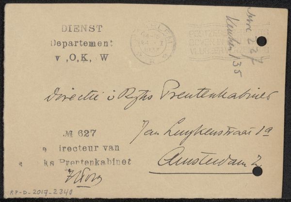 This print celebrating Queen Wilhelmina of the Netherlands’ 40-year reign was created in 1938 by the Haagsche Drukkerij en Uitgeversmaatschappij. It’s like a simple graphic poem, with its limited palette and focus on typography. The orange paper provides a warm, textured ground, kind of like a muted, earthy paint color. Then, look at how the black lettering is layered on top. The ink isn’t particularly thick or glossy; it sits almost matte on the page, emphasizing the graphic quality. Notice how the letters themselves have a gentle curve, a flowing, elegant line that contrasts with the rectangular format. That tension, between the overall structure and the fluid script, is what makes it so dynamic. I am reminded of Corita Kent, the pop art nun who combined text and graphic design in her screenprints. Like Kent's work, this print treats language as both message and image. Both share a sensitivity to the materials and a dedication to the power of visual communication. Ultimately, that’s what good art is about: a conversation, a dialogue across time and space.