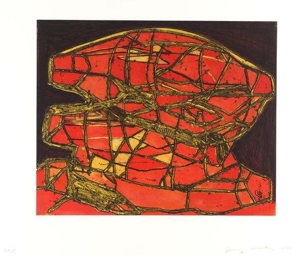 Editor: This intriguing, untitled print by Terry Winters from the Tate collection is a vibrant explosion of red and black. It feels primal, like looking at something fundamental. What do you make of this piece? Curator: It's fascinating how Winters uses the print medium. Consider the socio-political context of printmaking – traditionally a method for mass production and dissemination of ideas. Editor: Right, making art accessible. Curator: Exactly. Yet, Winters creates something deeply personal and abstract. The tension between the medium’s history and the work’s apparent opacity is compelling. The use of red is definitely striking too. Editor: I hadn't thought about that tension, that's really interesting! Curator: Thinking about this work in terms of the politics of imagery really enriches our understanding. Editor: Definitely, I see it in a completely new light now!