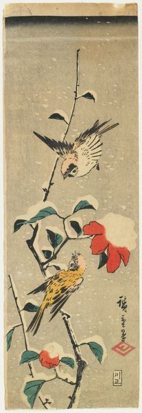 Utagawa Hiroshige created this woodblock print, Sparrows and Camellias in the Snow, in 19th-century Japan. The scene presents a vertical arrangement of softly coloured elements. Hiroshige masterfully orchestrates colour and form. The delicate pinks of the camellias offer a gentle contrast to the muted blues and whites of the snowy backdrop. The texture is suggested by the dense, regular pattern of snowflakes, creating an immersive, almost tactile experience. Compositionally, the branches reach across the space, framing the sparrows in mid-flight, which introduces a dynamic energy to the otherwise tranquil setting. This print exemplifies the Ukiyo-e tradition, capturing transient moments with sophisticated techniques. Hiroshige doesn’t merely represent the external world; he also evokes a sense of transience, a key concept in Eastern philosophy. This artwork invites us to consider the interplay of nature, art, and the ephemeral nature of experience.