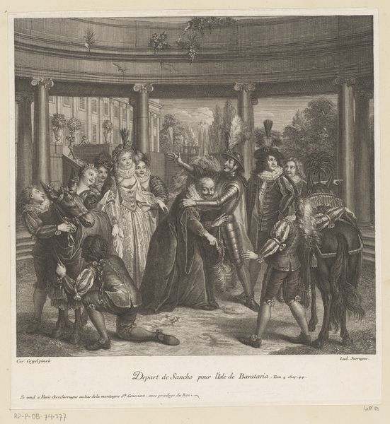Editor: Here we have "Don Quichotte raadpleegt het betoverde hoofd bij Don Antonio Moreno," an engraving by François Joullain, dating from around 1723-1724. It's incredibly detailed, almost theatrical. The faces of the people surrounding the table express such strong emotion, with an eerie head dominating the scene. What stands out to you in this work? Curator: It’s fascinating how Joullain captures the anxieties and curiosities of the time through this scene. Notice how the central figure, the “betoverde hoofd” or enchanted head, becomes a focal point, acting almost like a mirror reflecting the desires and fears of the onlookers. It sits centrally on a lavish draped table. Does the gathering remind you of anything in our time? Editor: I hadn’t thought of it that way! Perhaps it relates to the draw that people experience through mediums, or even modern technologies that propose to tell us what the future may hold. Are the fashions and objects telling us something, too? Curator: Exactly! This scene serves as a visual compendium of symbols of power and wealth: the lavish clothing, the busts in the room. And let’s consider Don Quixote himself. He embodies a longing for a past age, which directly intersects with the new era of The Enlightenment. What emotional layers might the artist reveal? Editor: The engraving is complex. There are expressions of wonder but also anxiety and suspicion, particularly from Don Quixote, almost as if he senses the performative aspect of this “enchantment." Curator: The performance speaks volumes about the society depicted, it hints at their longing for something beyond rational understanding. In art, what do we gain through such visual analysis? Editor: Seeing how artists used symbols provides another view on what people cared about, feared, or aspired to in their daily lives. Thanks! Curator: Precisely! Symbols open pathways to history, revealing truths about culture, memory, and shared humanity through the passage of time.