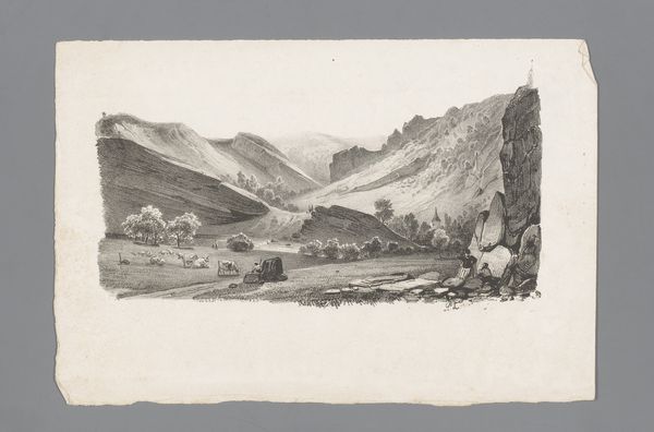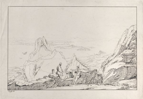 Martinus Rørbye rendered this landscape with graphite, likely en plein air. Rørbye was born in Norway, but he made his career in Denmark during the Danish Golden Age, a period marked by intense national romanticism. His travels, including his time spent in Norway, shaped his unique perspective as an artist. Unlike some of his contemporaries, Rørbye often depicted everyday life, and infused his landscapes with narrative elements, inviting viewers into the scene. The presence of figures such as the resting men and women by a chopping block adds a human element to the grandeur of the natural setting. Consider how Rørbye negotiates traditional landscape painting with a subtle critique of social roles. The figures become a poignant reflection on labor and leisure. In this sense, the drawing is not merely a landscape, but a social tableau.