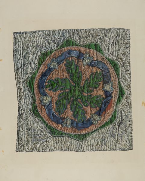 Editor: Here we have Frank Maurer’s "Pillow Top," made sometime between 1935 and 1942. It appears to be a drawing, maybe a study for a textile? There's something so comforting about the repetitive stitching motif. What stands out to you? Curator: I immediately consider the materiality and the process involved in its creation. The textile inspiration is crucial here, not just as subject matter, but as a nod to traditionally "female" crafts and their devaluation within art history. Maurer elevates this humble process through drawing, prompting questions about the division between craft and fine art. Editor: That’s fascinating! I hadn't considered the social context of the textile medium itself. What about the repeated leaf pattern and the muted colors? Curator: The organic patterns suggest a connection to the Arts and Crafts movement, where nature and handcraft were valorized against industrial production. Notice the imperfect symmetry, though. It feels handmade, resistant to the standardization of the machine age. Editor: So, it's a celebration of the handmade and natural, but through the unexpected medium of drawing? It’s interesting to think of him deliberately choosing drawing to represent textile work. Curator: Exactly! The labor involved, the careful rendering of stitch-like marks…it calls attention to the often-overlooked skill and time inherent in textile production. And look at the title: "Pillow Top." Is it a design, a suggestion, or a comment on domestic comfort during that period? What do you think? Editor: I'm starting to see the artwork less as a simple depiction of a pillow, and more as a commentary on the value and process involved in domestic work. It's making me rethink what I initially considered “comforting.” Curator: Precisely. By focusing on the means of production, on the implied labor and the social context, we can unpack the complexities hidden within this seemingly simple "Pillow Top". It questions what art *is*, how it is made, and *who* makes it.