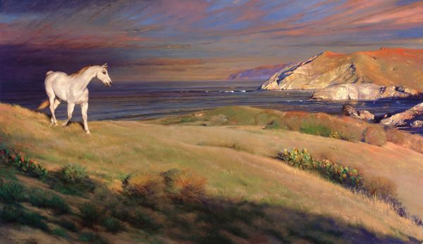 Editor: So, here we have Rockwell Kent's "Young Spruces, Maine Coast," painted in 1955. It's so…serene. The composition is striking, so smooth, almost dreamlike. The colors feel very calming, like a memory of a perfect day. What do you see in this piece? Curator: It whispers to me of resilience. Maine is not an easy place; that landscape is all granite bones and a stubborn, windswept beauty. These young spruces aren't just "pretty trees"; they are testaments to life clinging to existence, growing in spite of it all. I imagine Kent standing there, painting *en plein air,* battling the breeze. Does the composition remind you of anyone? Think back… Editor: Hmm…The starkness…the vast horizon… Maybe a little bit of a Rothko vibe? Though way more representational. Curator: Exactly! Kent's using realism, but he simplifies, elevates, finding almost an abstract grandeur in nature. It makes you think, doesn’t it? Are these the *only* spruces, brave green beacons? Or are we seeing a small detail of some larger wood? What might be to the sides of our viewpoint? The painting asks to be wondered about as much as seen. I imagine there might be many little secrets if one went looking. Editor: That’s a wonderful thought, thank you. I never considered what exists just off-canvas before! It's made me think of this painting quite differently! Curator: That's art's little trick on us, isn't it? A gentle invitation into a world both seen and imagined.