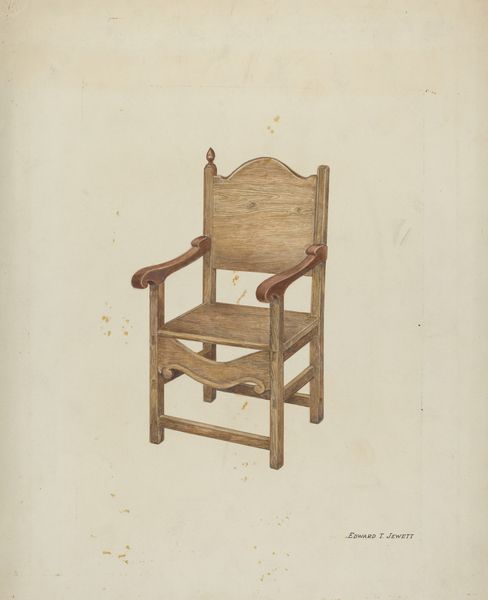 Curator: Here we have Rafaela Gomez’s "Rawhide Bottomed Chair" from 1940, executed with watercolor, pencil, and perhaps charcoal, judging by the line work. Editor: My initial thought? Humble. Utilitarian. There's a quiet dignity in its simplicity; it makes you think about home. Curator: Yes, the stark realism really emphasizes the objectness of the chair, its almost brutal construction... Observe the careful attention Gomez pays to the subtle gradations in tone, lending weight and presence. The materiality is key. Editor: Brutal? Maybe… But I find beauty in its bareness, its honesty. It isn’t trying to be anything it isn't. It evokes a sense of weathered comfort. Like a well-worn saddle, that rawhide has stories etched into it, don’t you think? Curator: Rawhide’s tensile strength is remarkable… What’s compelling, formally, is the contrast between the rigid geometry of the frame and the yielding organic curve of the seat. It plays with our notions of support and resilience. Editor: You see tensile strength, I see a well-placed backside. It makes me think of late afternoons, cool lemonade, maybe some porch-swing philosophy with grandma… A kind of slow life that feels far away now. It's less about the structure, for me, and more about the life lived around it. Curator: The drawing, beyond its representational function, really dissects the concept of support and repose in pictorial space; notice the implied negative space. The chair occupies this blank page. Editor: To me, it almost becomes a portrait, but a portrait of absence. The chair's alone, suggesting an invitation for companionship. This stark loneliness—that really stands out for me. Curator: Indeed, perhaps that loneliness contributes to its unique aesthetic… a successful representation of form meeting the human condition. Editor: Well said. All of that from a simple old chair! A little humble thing harboring vast complexities of interpretation, if we bother to really see it.
