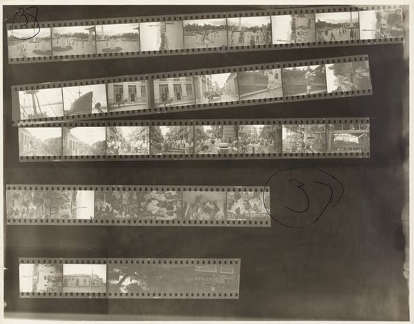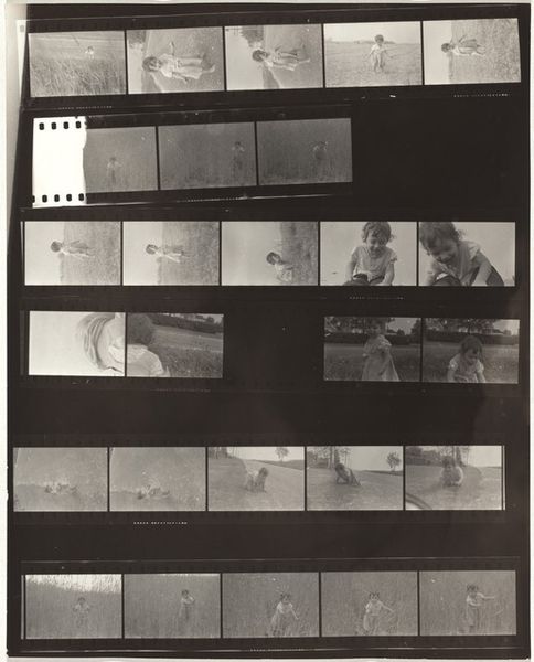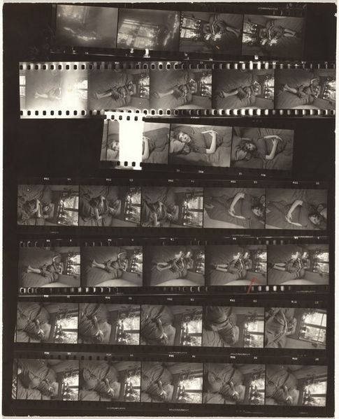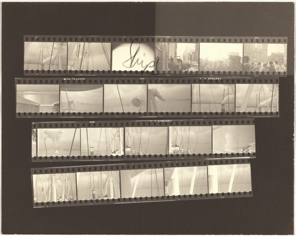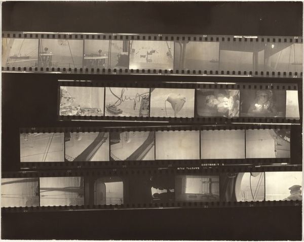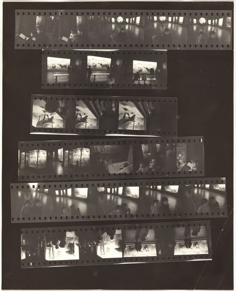 Editor: This is Robert Frank’s "Hollywood 64" from 1958, a gelatin silver print showcasing several strips of film negatives. What strikes me most is how Frank plays with light and shadow and how it guides the eye through the sequence of images. What elements of its composition are most important to note? Curator: Consider the layering itself as part of the artistic statement. Each strip presents variations, visual motifs – note the recurring figure of the man on the stairs, contrasted with scenes that seem almost dreamlike, abstracted interiors. It's a study in contrasts. The linearity of the film strip clashes intriguingly with the curvilinear shapes within the individual frames, creating a tension, a visual dynamism. Editor: It's interesting you point out the curves; I was so focused on the squares of the individual film frames. So, is Frank deliberately playing with contrasting forms, not only within the image but also through the very medium of film? Curator: Precisely. Frank manipulates the inherent structure of the photographic medium – the linear sequence, the defined frame – to create a disjointed narrative. Ask yourself, what happens if you were to focus solely on each shot individually, forgetting its location on the strip? What about tracing continuities throughout the frames themselves, noticing shapes as they echo themselves into another, without following the linearity of the film? How does that new, atemporal reading impact your understanding? Editor: That’s fascinating. Looking at it now, deconstructing the narrative frees my interpretation from an apparent logic or storyline, allowing me to see it as a formal investigation into form, shadow, and sequence. Thanks, I had not appreciated that. Curator: Indeed. Art resides not just in what is represented, but in how the representation is constructed. It’s an arrangement of tones, of shapes, and, crucially, a disruption of expectations of seamless photography.