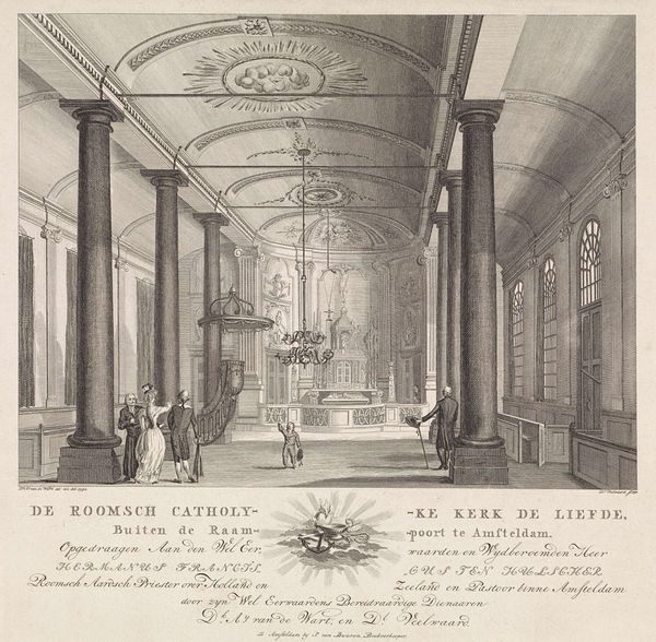 Caspar Jacobsz. Philips created this print of the Remonstrant Church in Amsterdam using etching. At first glance, the overwhelming visual experience is one of order and measured space. The composition is structured around a strict central perspective that leads the eye towards the back of the church, while the architectural elements—the pillars, arches, and balcony—are rendered with precise lines. The detailing in the organ and the wooden ceiling adds a layer of complexity to the otherwise simple geometric forms. The choice of etching as a medium enhances this effect, with its fine lines and tonal range creating a sense of clarity and depth. This calculated structure speaks to the Enlightenment ideals of reason and clarity that would have been circulating at the time. It reflects a broader cultural desire to impose order on the world through rational design, making the church a physical manifestation of intellectual and spiritual values. Consider how the architectural structure is not merely a backdrop but an active participant in shaping meaning.