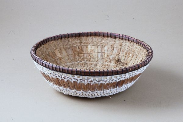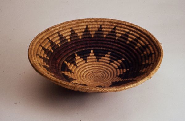 This temple basket, of unknown date and by an anonymous maker, is comprised of natural fibers and now resides at the Minneapolis Institute of Art. The initial visual experience is one of concentric containment. The basket's form—round and shallow—coupled with its natural materiality, evokes a sense of groundedness and simplicity. Consider the structure: horizontal bands of alternating color and texture segment the basket, leading the eye in a continuous circuit. The dark, tightly woven rim contrasts sharply with the light, fibrous body. This pattern, combined with the detailed beadwork, creates a visual rhythm that is both decorative and structurally integral. Semiotically, the basket operates on multiple levels, it is both functional and symbolic. In closing, the basket's tightly controlled form and decorative embellishments challenge conventional divisions between utility and art, underscoring the complex relationship between function and meaning. This invites continued interpretation within evolving cultural dialogues.