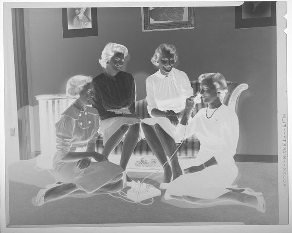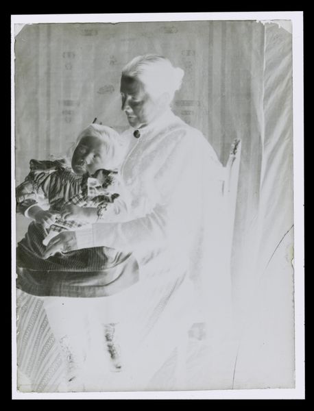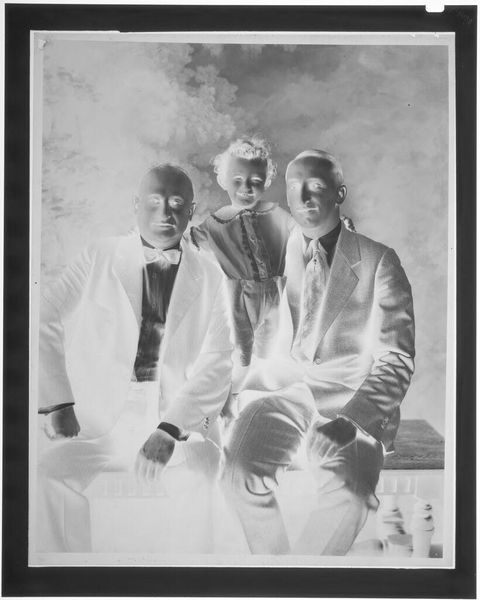 Curator: The Hamblin Studio gives us this intriguing photograph, titled "Untitled (portrait of two men with a child)." Editor: The tonality strikes me first. It's a high-key image, almost bleaching out the figures. It creates an odd sense of dreamlike remove. Curator: Indeed. The two men, dressed in suits, flanking the child… it's a tableau of early twentieth-century patriarchy, wouldn’t you say? The men look severe, proper, and imposing. Editor: Yet there's an ambiguity. The starkness softens the details, creating an ethereal quality. Is it a memory? A staged fantasy? The composition itself is classical—balanced, but the bright light destabilizes it. Curator: Perhaps the light serves to elevate them, as if they are icons in their social roles. This composition, in its formality, speaks to a very specific cultural moment. Editor: Or perhaps that very specific moment is being deconstructed. Curator: Interesting perspective. It's a photograph that raises questions more than it answers, certainly. Editor: Exactly. And that’s where the power lies.