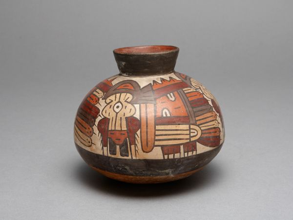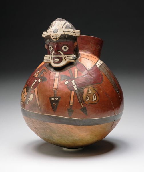 Curator: Here we have a remarkable piece: a Nazca stirrup vessel, dating from about 180 to 500 CE, crafted in ceramic. It’s entitled “Stirrup Vessel in the Form of Figure with Abstract Motifs and Trophy Heads on Torso.” Editor: My immediate impression is the tactile quality of the fired clay. It’s visually grounded and quite expressive, despite the rather simplified figuration. I'm curious about the labor involved. Curator: Absolutely. The forming and firing process speaks to sophisticated understanding of materials and the technology required to achieve this level of artistry. The smooth surface and precise painting reveal exceptional skill. Editor: And what's striking is how the abstract motifs, presumed trophy heads and the human form seem intrinsically linked to the ceramic vessel itself. The surface isn't merely decorated; it becomes an integral part of the narrative. Was it built in modules perhaps? Curator: That interplay of figure and form creates a powerful visual language. Notice how the geometric patterns and abstracted figures create rhythm and balance, yet hint at complex symbolic meanings. The artist has skillfully created dynamic tension. I imagine that this vessel represents a key Nazca figure or mythological being. Editor: Indeed. We must consider the materiality of those abstracted forms – they are all tied to labor: the mining of pigments, the gathering of resources for firing. The fact that trophy heads are alluded to certainly offers some context as well – some insight to violent times that would affect ceramic-making societies deeply. What are the known sites of where such vessels were created, fired, and utilized? Curator: The vessel's provenance suggests it played a ritualistic, perhaps even socio-political, role. Vessels such as these often accompany burials in the Nazca region of Peru and represent the cyclical nature of life and death as it was practiced then. The stirrup handle, the effigy, and the decorative imagery seem intrinsically interconnected to their views of power and transformation. Editor: Thinking about that connection – the materials and the cyclical use to celebrate or memorialize people– brings it all together. A ceramic vessel, so simple and grounded, yet a symbol of a more complicated and brutal reality of conquest. It transcends utilitarian object into a profound cultural artifact. Curator: Precisely. Viewing the formal aspects combined with a keen sensitivity to that era enables us to appreciate the brilliance embedded in such deceptively simple ceramic forms.