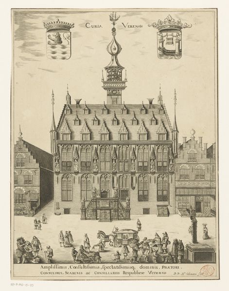 Curator: Editor: Jost Amman’s engraving, "Festa della Sensa (vierde gedeelte)" from 1679, showcases a detailed cityscape scene with a fascinating allegorical scene floating above it all. There’s so much activity crammed into the image; it’s incredibly detailed. What stands out to you most when you look at it? Curator: You know, it strikes me how Amman blends the earthly and the divine here. Look at the meticulous detail he dedicates to the architecture, and then you see this celestial allegory sort of plopped right on top. I wonder if Amman perhaps liked this superimposition. A bit comical, isn't it? And that perspective… Do you get a sense of reality, or something more dreamlike? Editor: Dreamlike, definitely. The lion with wings…and what is that figure crowning it? And the procession seems utterly unphased by this happening right above them! Do you think that it refers to Venice? I am struggling to understand that symbolism. Curator: Spot on! The lion is Saint Mark of Venice. That lady could be Venice personified crowning him. I think what you are sensing here is civic pride; they were quite the force back then, in trading and conquest. Do you also sense almost an aspiration there, wanting it to be larger than life? Editor: That makes a lot of sense. So it’s like a…PR exercise? Reminding people of their power? Curator: Precisely! A little visual propaganda, perhaps. And considering the context of its time—Europe was changing significantly –you have to imagine they want people to buy in. What is more fascinating: that there is no mention in any history book about the parade below, or this allegory on top? I think it is genius! Editor: Propaganda, huh? Makes you wonder about all the hidden messages in art, doesn’t it? This piece really opened my eyes to how art can be a historical record, but also a carefully constructed message. Thanks for sharing that! Curator: My pleasure! It is always worth reading between the lines. Perhaps everything around us hides deeper motivations? Something to think about!