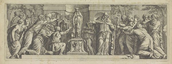 Curator: My first impression? It’s a stage, isn’t it? Stark and poised, like a scene from an ancient drama unfolding. Editor: Indeed. We're looking at "Rechter die een vonnis wijst," or "Judge passing a sentence," a print by Battista Franco, created sometime between 1520 and 1561. Curator: So, Franco’s grappling with justice, or the performance of it, at least. Look at the robed figures—the women down front seem so… burdened, like symbols of compassion, while the guys up top are caught up in some power-play of their own. It reminds me of freeze frame in a heated movie scene. Editor: Precisely, the print evokes profound concepts tied to order and authority. The judge, positioned prominently on the dais, becomes a focal point through which cultural memory is reflected. Notice the architectural backdrop, typical of the Italian Renaissance, and how it frames the scene, lending a gravity. It's like justice isn't dispensed but performed. Curator: Performed is the right word! It's like those austere Roman statues – the blank eyes staring off at some point we can't access anymore. But there’s an agitation there, too. See the men’s gestures and grimacing facial features in the background. Are they in disagreement about the judgement? Is one covering up a disagreement of their own? Editor: That kind of ambiguity can actually work symbolically. The figures gathered around, some appearing contemplative, others seemingly concerned, suggest a complex tapestry of societal attitudes towards justice. The symbols—the garments, gestures—speak to how judgement shapes civilization. We find these types represented over centuries, constantly evolving in ways both subtle and profound. Curator: I'm struck by the shadows and the hatching of the lines. They amplify a tense mood and sense of urgency in something created over 450 years ago! To think, even in Renaissance Italy they had something to say about jurisprudence. It begs the question what they believed was essential in delivering justice. Editor: A very fitting thought! Through careful consideration of these historical symbols and their psychological echoes, we arrive at a richer comprehension of justice through Battista Franco’s print. We learn of our continuing, though maybe unconsciously, wrestling with fundamental questions of what constitutes fairness, reason and humanity itself.
