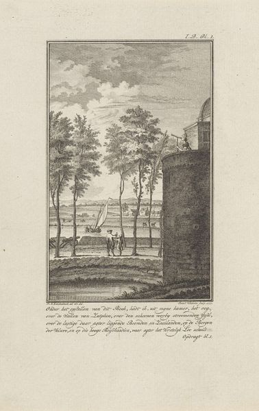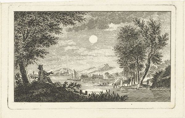 Curator: The engraving "Weids landschap met twee figuren en zeilschepen," created in 1799 by Izaak Jansz. de Wit, presents a serene landscape crafted through the precise medium of engraving. The figures are small in comparison to the landscape they inhabit, it seems… isolated somehow. What visual elements strike you most profoundly within this composition? Editor: I’m fascinated by how the artist used only lines to create depth and texture. The details in the foliage, water, the ship sails - especially for something that looks like it would require great care with pressure. What does the balance between light and dark, achieved solely through line work, suggest to you about its artistic intent? Curator: Note how de Wit masterfully employs hatching and cross-hatching to simulate tonal gradations, thus creating spatial recession and atmospheric perspective. The density of the lines in the foreground accentuates the roughness of the nature there. The controlled variations manipulate our perception of volume and surface texture. Editor: It's almost like a black-and-white photograph, though far less realistic given how blurry photography was in that period. In other words, the tonal contrasts are high. What does that suggest, artistically? Curator: Perhaps the heightened contrasts, achieved without colour, distill the landscape to its most essential forms. In the broader formalist context, consider this work alongside contemporaries: how might its manipulation of line, light, and shadow reflect the stylistic values and aesthetics of its time? Editor: I can appreciate that a little bit more with a frame for that, how the line work and tonal shifts can suggest specific emotional or compositional qualities without being photographically realistic. It's almost like realism can be "too real," and lose some power in what can only be evoked through the artificial. Curator: Indeed. By dissecting the formal elements, we move toward a richer understanding of its artistic intention and aesthetic impact. Editor: Okay. I see what you mean. Thanks for your thoughts on this engraving!