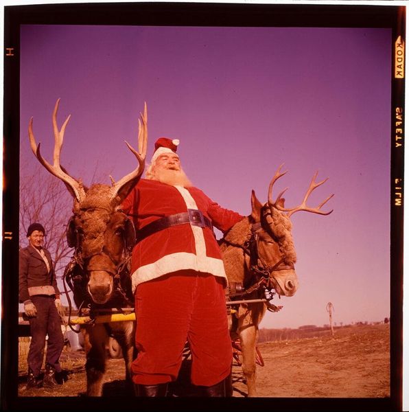 Editor: This small, untitled photograph by Jack Gould depicts Santa with some children. It feels like a snapshot of a memory. What symbols stand out to you in this image? Curator: The Santa figure is central. But, how does this depiction compare with our modern commercial Santa? His suit is slightly off, his beard perhaps not as perfect. What does this less polished image evoke? Editor: A sense of authenticity, maybe? Curator: Perhaps. It taps into the communal memory of simpler celebrations, less defined by mass marketing and more by shared experience. Editor: I see. So, the imperfections are actually meaningful. Curator: Precisely! They become symbols of a less mediated, more personal connection to the holiday. It's fascinating, isn't it?