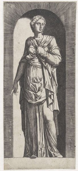 Editor: This is "Libische Sibille" by Lambertus Suavius, dating from somewhere between 1520 and 1567. It's an engraving, a print of a classical figure. She looks almost stoic, set against the radiating lines in the arch behind her. What strikes you about this piece? Curator: The figure's placement within the radiating arch immediately calls to mind the visual language of halos or divine emanations, doesn't it? Consider the Sibyl herself; she is far more than a mere mortal woman. She's a seer, a vessel for prophecy. Editor: So, it’s about seeing her as something more than human? Curator: Precisely. The radiating lines transform the architectural space around her into a field of energy, indicating her unique status and divine connection. Look, too, at her attire and bearing, which lend to her significance and permanence within cultural memory. Editor: The drapery definitely gives her a sense of importance, almost theatrical. Is that a deliberate reference? Curator: Undoubtedly. The Renaissance was deeply invested in the visual rhetoric of ancient Greece and Rome, of course, but beyond pure aesthetics, the Sibyl occupies a critical position at the intersection of classical and Christian thought. She symbolizes pre-Christian wisdom that foreshadowed Christian revelation, creating continuity across historical periods. Don't you think the artist here is emphasizing the visual weight and historical importance this figure possesses? Editor: I hadn’t considered her that way before, as bridging pagan and Christian worlds. I was too focused on the image as simply a classical figure. Curator: It’s a visual reminder that the Renaissance sought not to reject the past but to build upon it, finding echoes of truth and beauty across different ages. Now, how does this altered perspective change your appreciation for the work? Editor: It adds so much more depth! Knowing that shifts how I understand the symbols and intention. Thanks for clarifying the Sibyl’s important position. Curator: Absolutely. Looking closely at symbolic images can unlock worlds of cultural significance!