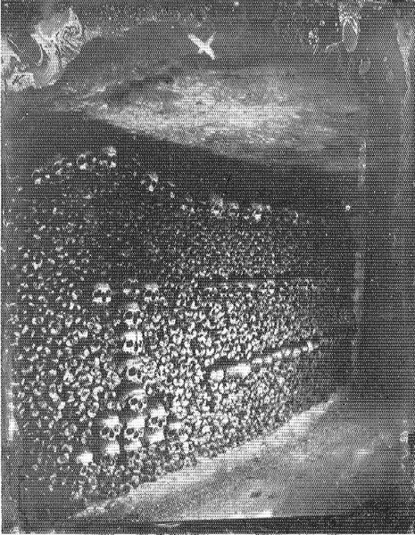 Curator: This gelatin-silver print, titled "Catacombes De Paris", was captured by Felix Nadar around 1861. A somber, monochromatic study of the Parisian catacombs, it is dominated by carefully arranged stacks of human skulls and bones. Editor: A chilling still-life that's unsettling. I feel an almost primordial fear bubbling up. What strikes me immediately is how Nadar has captured light emerging in that tunnel-like space. Curator: The mastery of light and shadow, is quite remarkable given the constraints of early photographic techniques. See how Nadar uses it to organize the pictorial space. He carefully placed a light source, and thus transforms what would be a confusing space into a geometric meditation. It emphasizes the formal arrangement, turning the morbid into almost architectural order. Editor: But beyond the technical bravado, there’s the physical labor itself. This isn't just stumbled-upon arrangement. Imagine the workers, probably poorly paid, carefully arranging these bones for some public viewing. What were the health implications of constant interaction with the decaying matter, the social hierarchy of this work. Curator: And what about the semiotic weight of that order? Those skulls staring. What stories are locked into each face of the stacked skeletons. It reminds me so strongly of Baroque Vanitas paintings which use visual allegories, like skulls, to comment on earthly possessions. This work also pushes towards those limits. The limits of artifice. Nadar's choice to highlight structure with dramatic contrast shows this is less documentary and more meditation. Editor: Precisely! And to build on that idea, one cannot disassociate these orderly stacks from the history and implications of their creation. The photograph then stands as a chilling document of labor conditions, disposal rituals, and also as an early study in the visual processing of immense quantities of bones in a contained architectural form. Curator: Considering the meticulous lighting and considered composition, I would describe this photography as an artifact where Nadar engages with themes related to death. His masterful utilization of tonality is a feat, converting historical ossuaries to more. Editor: Perhaps through it, the piece is both a testament and critique to order—showing the many faces, the artful and morbid, of materiality itself.