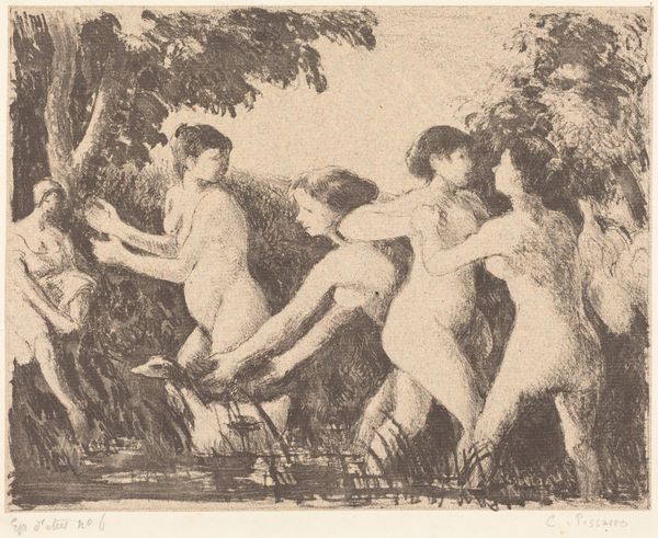 Cleo Damianakes created this line etching, *The Fountain*, likely around the middle of the 20th century. The print is dominated by three female figures, each entwined with the structure of a fountain. Damianakes uses line work to create a sense of depth and movement, especially in the cascading water and foliage. The composition is deliberately ambiguous, blurring the boundary between the natural and the artificial, between the figures and the architecture. Damianakes uses line to disrupt conventional form. The bodies are rendered with a mix of solidity and sketchiness, challenging traditional notions of beauty. The figures seem both classical and modern, reflecting a semiotic tension between the traditional and the avant-garde. By drawing on classical themes and simultaneously disrupting traditional form, the artwork avoids being fixed to a single interpretation.
