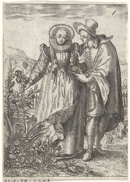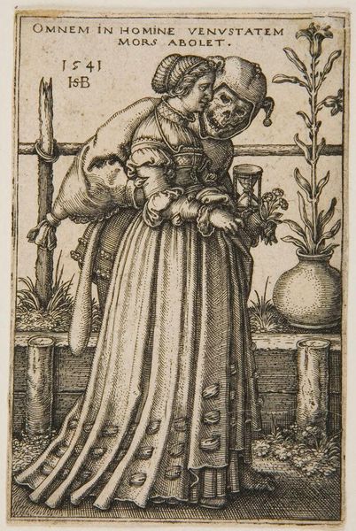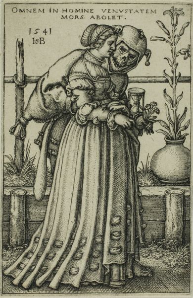 Editor: Here we have Sebald Beham's "The Lady and the Fool," created around 1540 as a print. It’s striking how much detail he manages to pack into such a small space. The scene feels intimate, yet there's also something slightly melancholic about the woman's posture. What do you see in this piece, considering its historical context? Curator: The melancholic mood is precisely what captures the spirit of the era, isn't it? Look closely at the symbols. The fool, often a figure of entertainment, here seems almost burdened, weighed down. Flowers, though beautiful, can also represent fragility and the fleeting nature of beauty and life. Note also that she is holding a bouquet of forget-me-nots; what cultural associations might a Renaissance audience make from this choice of flower? Editor: Are you suggesting the image goes beyond a simple depiction of courtship or leisure? Curator: Absolutely. Consider the period: The Reformation was challenging established social orders. The image might represent a commentary on the transience of earthly pleasures and the folly of attachment. Look at the garden setting itself – a confined space. It symbolizes a limited world. The woman's downcast gaze and the fool’s posture suggests introspection and maybe a sense of confinement within societal expectations or personal limitations. Editor: I see. So, the fool and the flowers aren’t just decorative elements but loaded symbols that invite a deeper reading of the print? Curator: Precisely. Beham provides the viewer of 1540 a narrative filled with signs which encourage greater thinking of the state of European society. How can an artist present these sentiments through an arrangement of line, form, and subject? What ideas will still resonate 500 years later? Editor: I never would have thought of it that way! Now the print appears a lot richer and more profound than I first believed. Curator: It is rewarding to unlock that knowledge and learn that every piece has some type of symbology that reflects an artist's perspective of cultural memory and continuity.