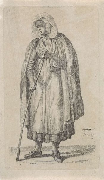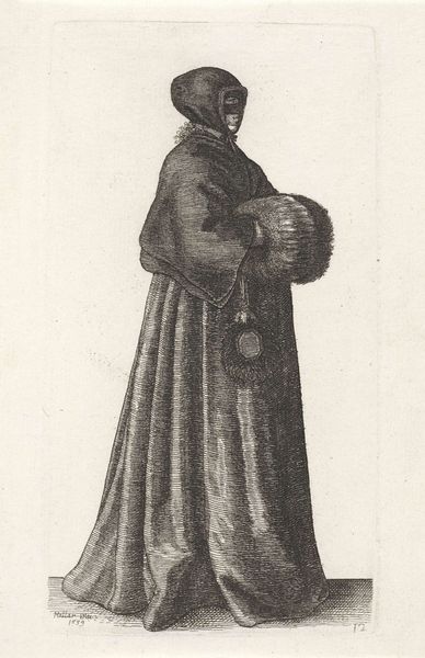 Editor: This is "Engelse vrouw met breedgerande hoed" by Wenceslaus Hollar, made in 1640. It’s an engraving, and what strikes me immediately is the formality of the figure; there’s something reserved and almost austere about her pose. What stands out to you when you look at this work? Curator: Immediately, the hat speaks to me – not merely as headwear, but as a proclamation. Its rigid brim suggests authority and perhaps even a certain aloofness. What does a broad-brimmed hat like this communicate about social standing in 17th century England? Consider how such adornment functioned as a visual signifier within the tightly structured hierarchy of the time. Editor: It feels almost performative, like she's deliberately presenting herself in a certain light. I wonder about the lace collar and the way the dress seems to flow; is there a specific symbolic language at play with these elements? Curator: Absolutely. Lace, meticulously crafted, represented wealth and status. But notice also the relative simplicity of her overall attire. Does that contrast create a visual tension, perhaps reflecting the societal pressures on women to balance piety with displays of affluence? It also reflects the iconography of the baroque period; it gives prominence to surface textures and theatricality. Do you get a sense of her personality or role in her society based on these details? Editor: I see what you mean about the hat now; it's like a shield. I suppose what I’m gleaning from it now is that this is much more than a simple portrait. Curator: Indeed. By looking at the signs and symbols embedded within, we decipher the portrait of an entire culture reflected in a single woman. The dress speaks to her class, gender, profession, time and era.
