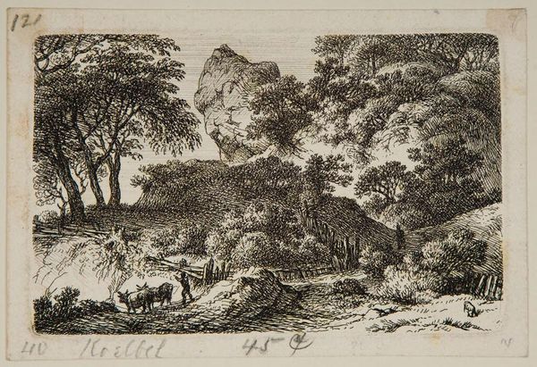 Curator: Joseph Anton Koch’s etching, Rocca di Mezzo, near Civitella, presents an Italian landscape teeming with detail. What strikes you first about this piece? Editor: The stark contrasts grab me—how Koch uses such intricate linework to evoke depth, but also a sense of constraint. It's like a meticulously curated diorama, yet also a potentially violent scene. Curator: Absolutely. The etching process, using acid to cut into the plate, allows for that fine detail. Koch, deeply influenced by his time in Rome, was interested in the picturesque, but also in imbuing landscapes with narrative and symbolic weight. Notice the hunting scene and the travelers. Editor: The hunting scene, yes—that’s what I mean by violent! Who has access to leisure and resources to hunt while others travel on foot or on horseback? The piece feels like a commentary on social stratification made visible through landscape. Curator: Koch was working in a period when the aristocracy's power was being challenged. The presence of these figures could symbolize the existing social order and its reliance on land and privilege. Editor: It's fascinating how a seemingly simple landscape reveals such layers. The natural world is never neutral; it’s always a stage for human drama. Curator: Precisely, art provides a mirror to society, reflecting both its beauty and its inherent contradictions. Editor: And compelling us to unpack them.