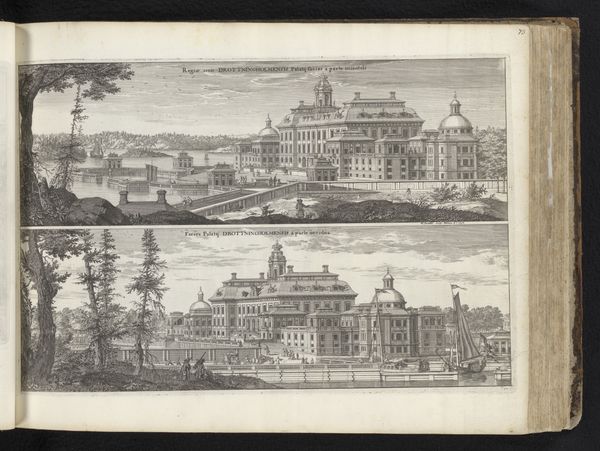 Curator: Let’s turn our attention to this engraving, "Paleis van Carl Larsson Sparre, vanuit het zuiden en het noorden," or "Palace of Carl Larsson Sparre, from the South and the North," created in 1692 by Willem Swidde. It presents two distinct views of a prominent palace. Editor: The detail is astonishing! And almost unnerving in its meticulousness. I mean, it captures this incredible architectural structure with geometric perfection. It gives the impression of rigid societal structures... and power. Curator: Precisely. Swidde's technique – the precise lines of the engraving – certainly echoes the Baroque aesthetic, known for its grandeur and order. Think about the social context: the ruling class was consolidating power. This palace and its representation served as visual manifestations of that power. Editor: So the clean lines, the symmetry…they’re not just aesthetic choices. They’re actively communicating a message. It speaks to the control and almost the performative aspect of power in the late 17th century. The way even the gardens and figures are rendered is almost diagrammatic; a symbol of order that represses individual experience and collective autonomy. Curator: Consider the intended audience for prints like this. They circulated among elites, reinforcing a shared understanding of status and authority. Editor: Which then creates a closed circuit. Images like this shape expectations, reinforcing a particular power dynamic as seemingly natural and inevitable. Who gets represented, and how, tells us everything. Curator: And thinking about access – even viewing it now, through the lens of the Rijksmuseum collection, frames how we understand its cultural value. We are participants in that story. Editor: Exactly. The echoes of that era continue. Analyzing the piece means recognizing the embedded power dynamics not only within the artwork but also in its legacy, prompting necessary conversations about privilege, access, and representation. Curator: Looking at this work from an architectural and social history perspective really demonstrates the complex interactions between art, power, and societal values. Editor: Absolutely, reflecting on how images like this shaped and continue to shape our perceptions, even centuries later, it makes it so necessary for continued critique.
