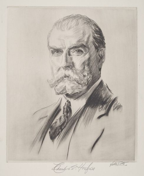 Curator: Here we have Philip Alexius de László's oil portrait of Charles Evans Hughes, completed in 1921. It’s a striking example of early 20th-century academic portraiture, capturing a man of significant political stature. Editor: He definitely has that “no-nonsense” vibe going on, doesn't he? All steely gaze and that perfectly sculpted mustache. It's like, "I have important decisions to make, and I don't have time for your shenanigans." Curator: Hughes was a prominent figure, serving as Governor of New York, Associate Justice of the Supreme Court, and later, U.S. Secretary of State. De László was a sought-after portraitist, known for his ability to convey not just likeness but also character. Editor: Absolutely. The brushstrokes are loose but confident, especially in the background. And that slightly-off-white suit almost makes him glow, adding to the feeling that he’s, well, important. He pops right out. Did the artist aim for an idealized version of him? Curator: I think so, particularly in his posture. There's a level of formality here that reflects the era and the expectations for portraits of public figures. The portrait's commission likely served specific political or institutional objectives. This portrayal certainly aligns with a specific type of leadership imagery that would have resonated at the time. Editor: Maybe. But it's also pretty subtle. It's like he's trying to inject a bit of personality, you know? The slightly tilted head, the way his eyes seem to bore into you, the soft details, like the brushwork around the right part of his white mustache... it gives him some individuality beyond just "important man." It’s kind of playful, actually. Curator: I can see your point. Ultimately, art institutions help establish cultural significance and contribute to shaping historical perceptions of people and their legacies through images like this. The setting, the very style…these are choices, after all. Editor: Exactly. So, he’s stuck here, memorialized in paint, forever judging me from across the gallery. It gives you something to think about, doesn't it? Curator: Indeed. The dynamics of power and representation, eternally framed. Food for thought.