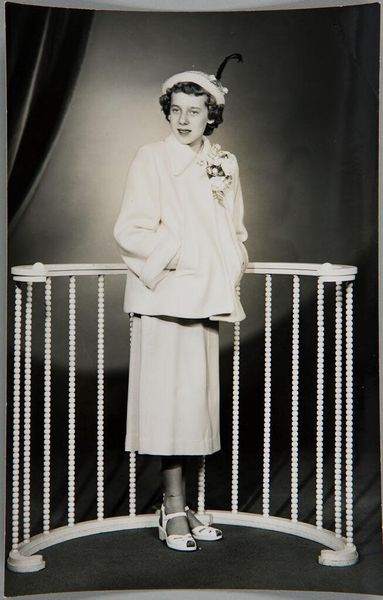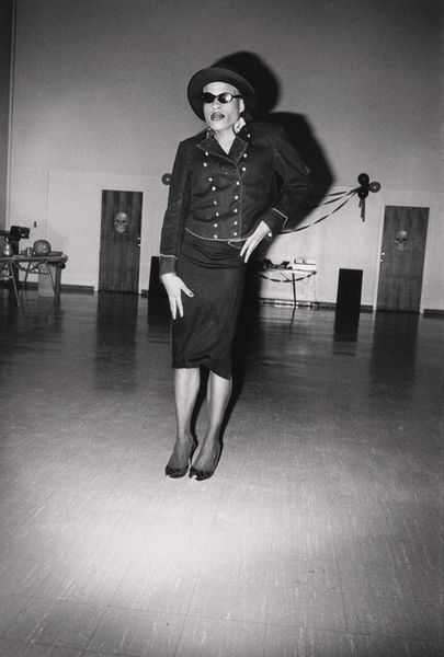 Curator: Here we have Annelise Kretschmer’s gelatin silver print, "Kostümaufnahme (Women's Suit)" from 1929. What are your first thoughts? Editor: Stark, and undeniably glamorous. The textures and the high contrast really draw the eye. There’s a tension between the soft feather boa and the more severe lines of her dress and hat. Curator: Absolutely. The composition is interesting; the subject is rigidly centered and almost pinned by light against a blank wall. Let's consider the context: Kretschmer was a prominent photographer during the Weimar Republic. The ‘New Woman’ was a prevalent social and cultural figure. To what extent does this photo serve that idea? Editor: Certainly, the androgynous styling plays into the Weimar fascination with gender fluidity, but her body language complicates things. Despite the confident suit, she stands with a contained stillness. Is it strength or submission? Perhaps both, reflecting the lived complexities facing women at the time. Curator: Precisely. Her gaze behind the lace veil, for example, could signal defiance, yet the shadow emphasizes her obscured expression. Considering photography's rising status during this period, Kretschmer may have consciously been testing what it means to create an "icon" or the very concept of ideal womanhood in flux. Editor: It's all rather performative isn’t it? This isn't necessarily a real woman, but a figure of style, captured by sharp photographic contrasts: hard and soft, light and shadow. It all points to her status as a designed, consciously constructed artifice, rather than someone "natural" as portraiture aimed for traditionally. Curator: A very astute observation. So then, even the photographic technique, with its high contrast and stark staging, serves not just to depict but to perform a certain visual and social rhetoric? Editor: Exactly! The high-contrast tones, stark lighting, and the unusual stylization all speak to an artistic intent that pushes beyond conventional representation. The interplay of textures—lace, feathers, silk, glossy flooring— creates a rich visual experience. It’s visually magnetic, I think. Curator: I agree. This image encapsulates so many aspects of its era. Its focus on modernism, performance of identity, and of course the rapidly shifting dynamics within Weimar society. Editor: It’s definitely given me a lot to think about. A deceptively simple photograph revealing a lot of complexity when we sit with it.