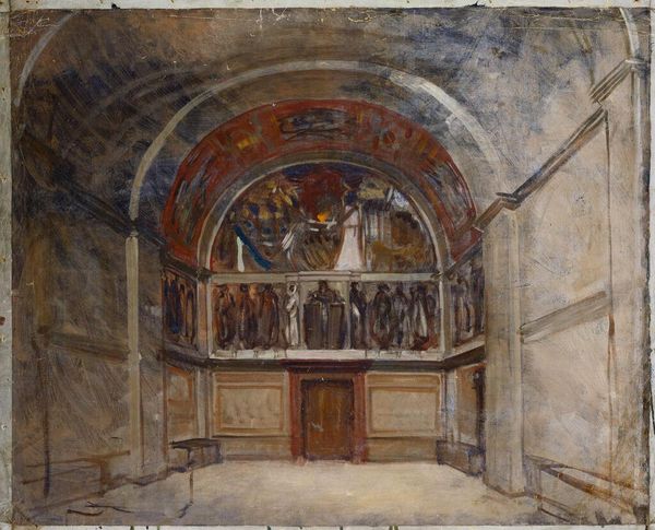 Albin Egger-Lienz created this painting of the Lienzer Pfarrkirche St. Andrä's choir using oil on canvas. The composition is dominated by strong horizontal lines and the imposing form of the organ that pull your eyes across the scene. Egger-Lienz’s perspective places us within the architectural space, encountering the scene directly. The painting employs a muted palette, focusing on browns, grays, and creams, evoking a somber mood. This reinforces a sense of place but also highlights the inherent contrast between the dark organ and the softly lit vault of the choir. The figures are carefully placed to create a balance, yet they do not distract from the central theme: the structure and light within the ecclesiastical space. The architectural framework is rendered with an almost scientific precision. This approach, while seemingly straightforward, raises questions about the relationship between art, space, and the human experience. The painting invites us to consider how we perceive and engage with constructed environments.