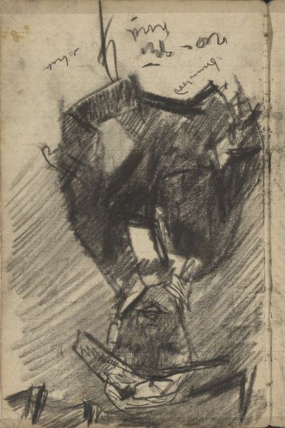 Curator: Welcome! Here we have "Figuren voor een poort," or "Figures for a Gate," a sketch by George Hendrik Breitner, created in 1893. Editor: Immediately I get the impression this is more about the *process* of observing than a finished piece. Raw energy, wouldn't you say? A quick grasping at form. Curator: Precisely. It's made with charcoal and pen and ink—look how Breitner uses varied pressure to give weight to certain lines. It emphasizes the materiality of sketching. This wasn’t about refined presentation; it’s work, it's almost like notes from a factory floor. Editor: Yes! It’s almost like a stage set in preparation—or maybe the skeleton of a dream I can't quite remember. Very dreamlike indeed! The bold strokes contrasting with those tiny numbers suggesting calendar dates... there's a playfulness here, juxtaposing rigid time with fleeting ideas. Curator: Note how these kinds of sketchbooks functioned as idea generators for Breitner. Consider, for instance, how he integrated text into visual experimentation, documenting figures and architectural forms he could later manipulate and replicate within his oil paintings, or in different commercial work for magazine, posters and so on. Editor: You can sense him trying to understand weight, and presence, with minimal means, searching with his hand. The gate almost fades. As I was observing, it reminded me of Cy Twombly or late Goya, something about that loose gesture which captures the intangible, something felt instead of seen. Curator: Good connections. And consider the economic aspect. A quick charcoal sketch requires less capital output than a major history painting. Breitner here employs his means efficiently, capturing a thought for later retrieval at minimum expenditure, just another raw material to be stockpiled alongside canvases, paints, and models' time. Editor: True! It is amazing to feel connected to those brief, concentrated moments of the artist trying to grab the thing. It does give us an unvarnished look into Breitner's way of observing and processing his world. Curator: Right. By seeing the stages, the preparation behind such sketches we are afforded the ability to connect the material process to the art piece, adding nuance in our appreciation. Editor: Precisely! It’s like having a conversation across time, witnessing art in the making.