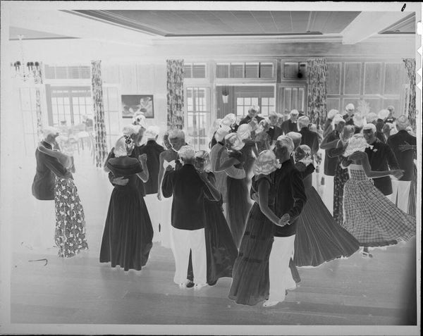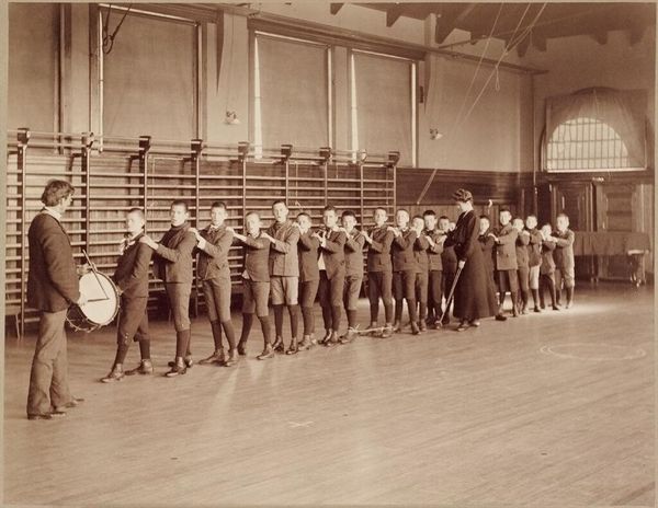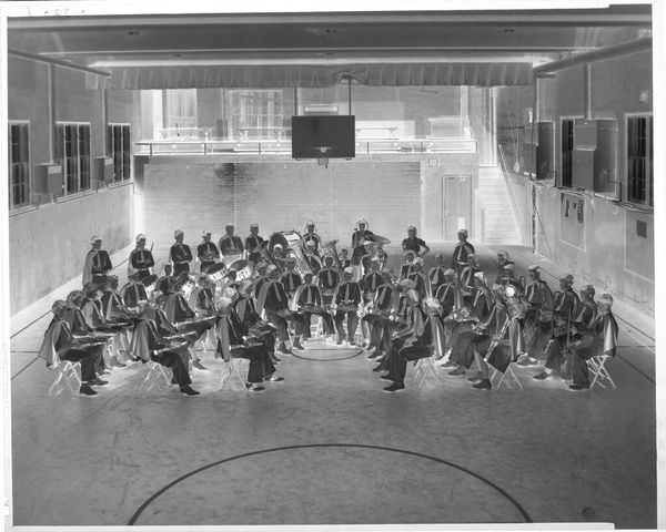 Curator: My first thought is the starkness of this image. The high contrast and the gymnasium setting create a rather sterile, almost clinical, atmosphere. Editor: This is an intriguing photograph from John Deusing, simply titled "Untitled (band practicing in gymnasium)." It presents a large band, seemingly military, in full uniform. Curator: The uniforms definitely reinforce that feeling of rigid structure. The instruments themselves become symbols of order and conformity, don't they? Editor: Absolutely. The photo captures a moment of collective discipline, a shared performance of identity. The gymnasium setting highlights this—a space for organized activity and training. Curator: I'm curious about the emotional impact on the viewer. The inverted tones give it an unsettling quality, perhaps emphasizing the loss of individuality within the group. Editor: I see that. It raises questions about the role of institutions in shaping individual expression. Who gets to play the music, and for what purpose? Curator: Indeed. It's a compelling study of how symbols—uniforms, instruments—mediate our sense of self and our place within a larger collective. Editor: I agree. It's a visually arresting image that prompts us to consider the complex relationship between the individual and the institution.