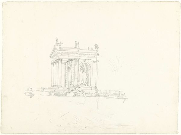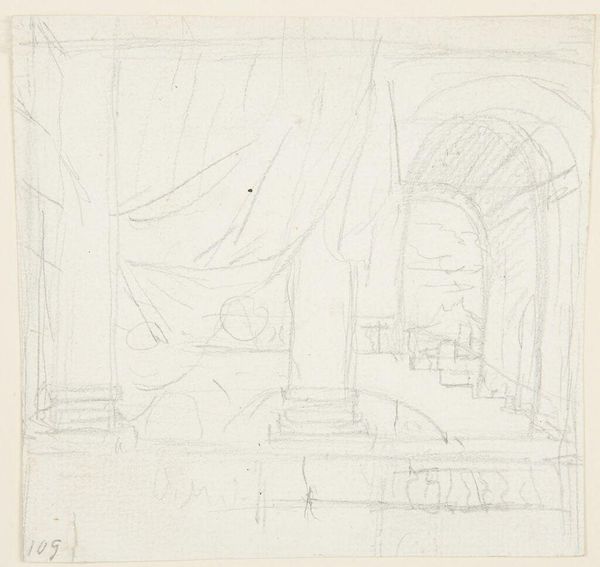 Jan Bulthuis created this sketch, “Design for a Decoration on the Occasion of the Alliance with France, June 19, 1795,” using graphite on paper. The sketch presents a symmetrical structure reminiscent of classical architecture, possibly a triumphal arch, with an arched central opening flanked by what appear to be columns and decorative elements. The composition's skeletal quality, achieved through Bulthuis's light and tentative pencil lines, directs attention to its underlying geometry. The structure’s symmetry, coupled with the repetition of architectural motifs, invites contemplation on the era's political ideals, such as liberty and equality. The drawing’s openness and lack of definitive form might symbolize the fluidity of political alliances, while the classical elements suggest an aspiration towards enduring values and the establishment of a new order rooted in historical precedents. The design's incompleteness leaves space for the viewer to reflect on the ever-evolving nature of political landscapes and their representation in art.