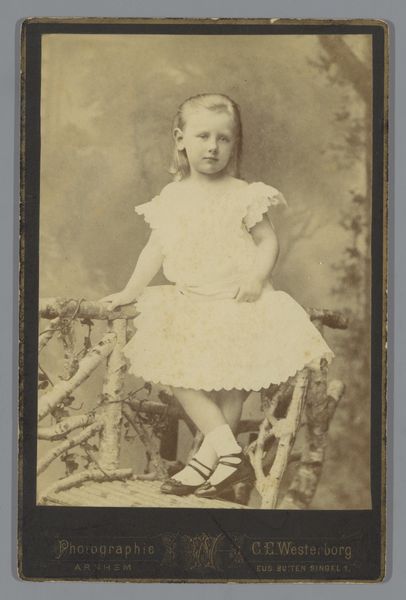 This is a vintage cabinet card photograph by Heinrich Wilhelm Wollrabe, showing an unidentified child standing on a chair. During the late 19th century, photography was becoming more accessible, yet remained a practice often reserved for the middle and upper classes. This portrait offers a glimpse into the constructed presentation of childhood during that era. The child, dressed in a pristine white dress, sturdy boots, and posed formally, embodies the Victorian ideals of innocence and decorum. The act of placing the child on a chair could symbolize raising them up, or it could be a tool to ensure they were in the shot. The child's expression is unreadable, inviting speculation about their thoughts and feelings. Wollrabe, who titled himself ‘Court photographer’ has created a lasting, albeit enigmatic, record of a life. This photograph encapsulates a moment frozen in time, prompting us to reflect on the layers of identity, representation, and the passage of time.